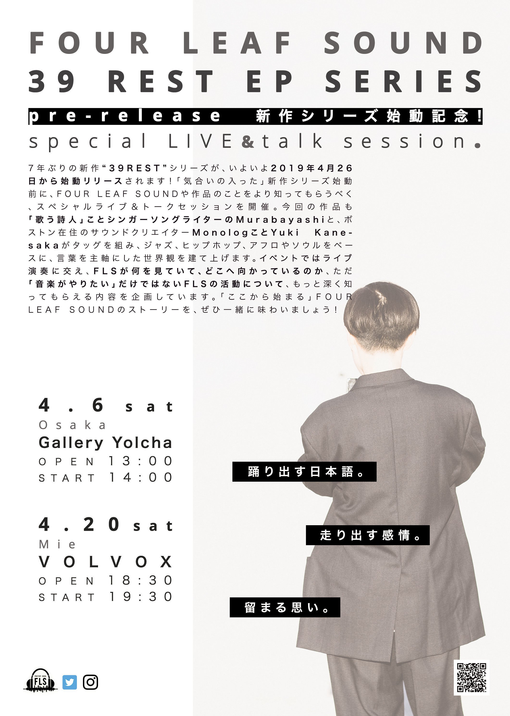 「閲覧無料ツアー」も本日で5箇所目。空間は違えど、それぞれの場所で、FOUR LEAF SOUNDの音と言葉が、人々の心に沁みていっているのを感じています。名もないfourleafの思いに寄り添い、サポートしてくださったみなさんに、改めて感謝をしています。先日、"39 REST" シリーズ始動前スペシャルライブ&トークセッションについてのお知らせメールを送らせていただきました。すでにご予約を何件か頂いており、嬉しい限りでございます。ミックス担当のあっちゃんこと、浅田あつしも、トークセッションゲストとして参加しますので、FOUR LEAF SOUNDのことに限らず、メジャーも手がけるプロのエンジニア/サウンドクリエイターとお話ししたい方も、ぜひご参加ください♪今回のイベントは、アットホームな雰囲気で、みなさんのお顔等を把握できる範囲で行いたい。。と思い、座席数をあまりご用意しておりませんので、ぜひお早めのご予約お待ちしております!(3月2日から一般予約が開始します。)(ご予約に関しましては、お送りしましたメールをご覧ください。)4月26日リリース予定の新作シリーズ第1弾は、今週からミックス作業に入っております。FOUR LEAF SOUNDにとって、すごく特別な今回の新作リリース。ぜひみなさんと共有し、味わっていけることを、楽しみにしております!