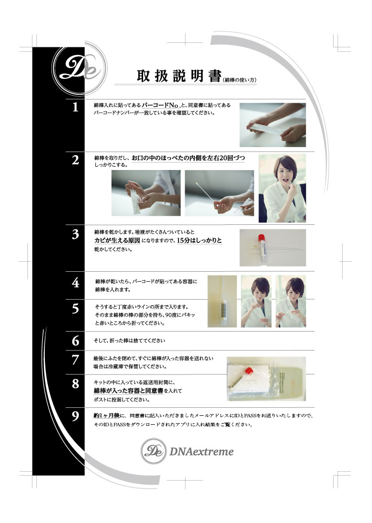 1:まず、遺伝子解析キットに同封されている同意書をお読みになったあと、下記手順で遺伝子解析のための作業を行ってください。