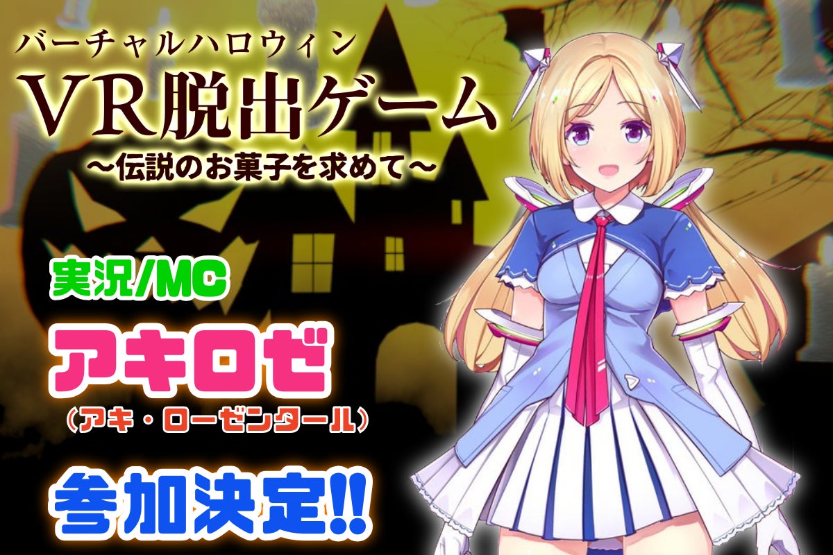 本日、バーチャルハロウィン VR脱出ゲーム ~伝説のお菓子を求めて~ に、実況/MCとして、ホロライブ1期生の『アキロゼ』こと、アキ・ローゼンタールちゃんの参加が決定いたしました。