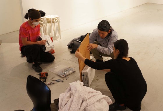 映像作家の越田乃梨子も作品の搬入が始まりました。プロジェクタの設置作業など。2台のプロジェクタがポイントです。