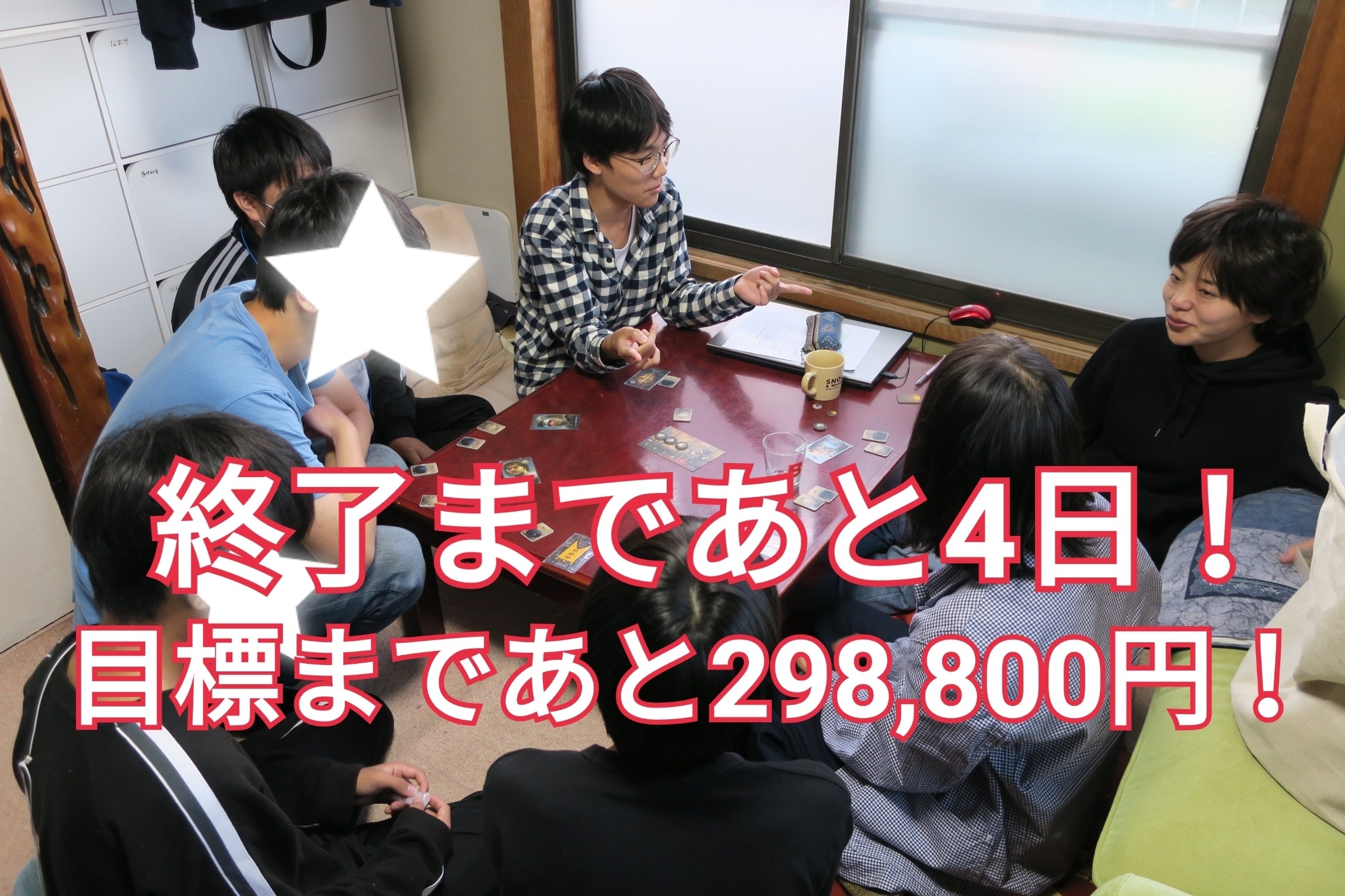 こんばんは。スタッフの山下です。 「ここ」の遊び時間は、テレビゲームや楽器の練習、 外遊びなどをして過ごすのですが、 ボードゲームも定番の遊びになっています。 その中でも人気なのが、「レジスタンスアヴァロン」。人狼ゲームのように自分の正体を隠して他の人と話し合い、 役職を推理し、正義と悪者陣営に分かれて対決します。 人狼ゲームとは違い、 誰も途中でゲームから退場させられることがなく、 最後までみんなが参加できるゲームです。「ここ」で人狼ゲームをすると、大抵代表の三科が「とりあえずなんか怪しいから倒しとこ」と退場させられます。 もし騙されて負けると、思いっきり笑われるので、 負けたくないという気持ちになるんです(笑) 「ここ」の生徒もスタッフも、顔に出やすいです。 特別な役職についたり、 図星なことを言い当てられるとニヤニヤしてしまいます。 正義なのに、「悪者やで」と攪乱させてくる生徒もいます。 なのでプレイしていて、本当に楽しいです! 演じることや、作戦を考えるのが上手い方、ぜひ「ここ」に来て、 一緒にプレイし、アヴァロンの極意を教えてください!広い引っ越し先で子どもたちとアヴァロン大会をしてみたいなと、 今思いつきました。 絶対引っ越したい!目標金額まであと298,800円!終了まであと4日です!ご協力よろしくお願いします。