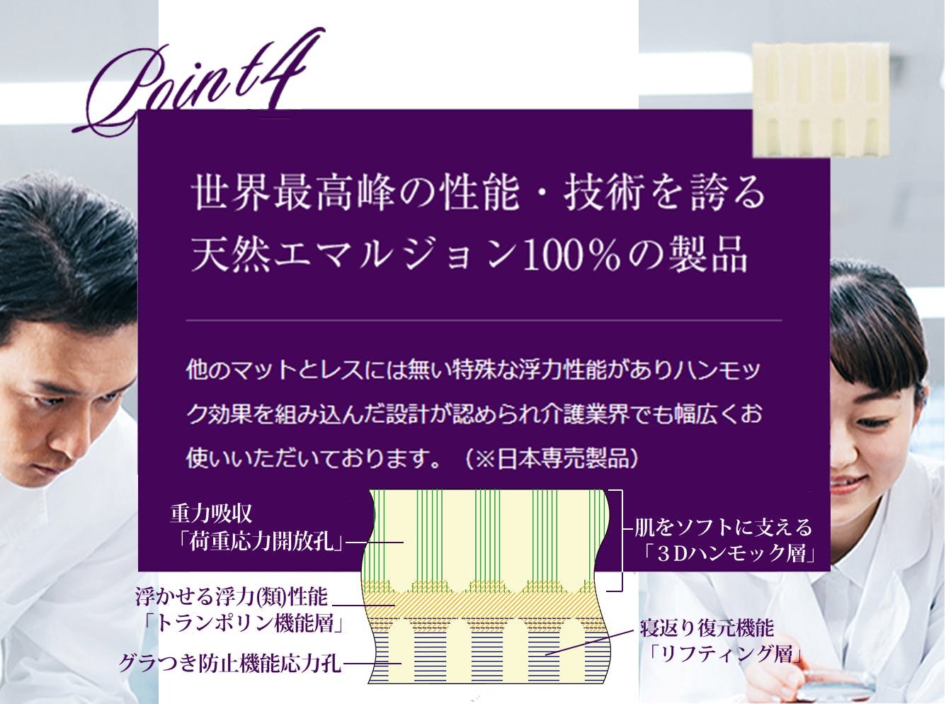 稀少な天然素材の3D(立体)3重構造で、浮力の寝具と呼ばれる「浮いている感じ」
