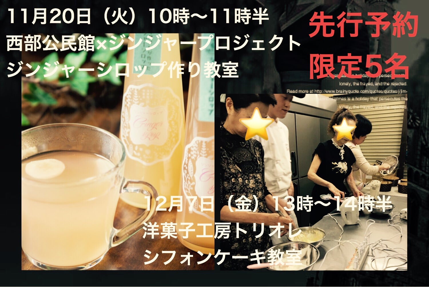 こんにちは! 本日は、返礼品の追加のお知らせです。 [200%達成御礼5名様限定参加券] 毎回20人待ち! 洋菓子工房トリオレのシフォンケーキ教室の先行予約ができます。今回は西部公民館さんでのジンジャーシロップ作り教室と合わせて2回分のチケットです。おかし作りやクラウドファンディングに興味ある方も是非いらしてください! ①11月20日(火)ジンジャーシロップ3本お土産付きジンジャーシロップ作り教室×1回 日時 11月20日 火曜日 10時〜11時半 場所 苅田町西部公民館(福岡県京都郡苅田町大字鋤崎481-1 0930-23-8100) 講師 寺尾咲子 内容 地元で採れた生姜を使ったジンジャーシロップ作り。作ったジンジャーシロップ3本のお土産付き 試飲あり ②12月7日(金)シフォンケーキお土産付きシフォンケーキ教室×1回 日時 12月7日金曜日 13時〜14時半 場所 洋菓子工房トリオレ (福岡県京都郡苅田町富久町2-23-18 093-436-4306) 講師 寺尾拓 内容 地元で採れた生姜を使ったシフォンケーキ作り。 作ったシフォンケーキはお土産に。出来立て試食あり。大人気講座です。 *万が一どちらかが来れない場合は別の日を設けます。(講座の内容は変更する場合があります)