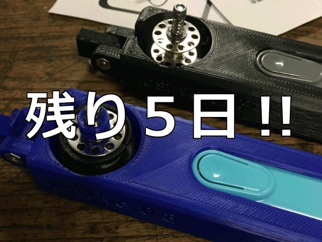 どうも東方です。10月18日に立ち上げて以来、ようやくこの日が来ました。来てしまった。最終日です。このプロジェクトを支援をしていただけるのは今日までです。ありがたいことに、2週間ほど前に目標金額を達成しましたが、その後も支援をいただくことができまして、現在は目標の120%となりました。本当にありがたいです。これから部品や材料の手配に入りますので、仕入れの費用や支払い、3Dプリンターの稼働など、現実的に出ていく費用も多いです。集まった金額が大きければ大きいほど良いよね、というのはありますよ。一定以上の数を作るには、先立つものが必要です。設計・開発している間は、試作を作って試して捨てる日々です。時間もかかります。お金は欲しい、無い袖は振れない。ワカサギも釣ってみたい。ただ、「欲しいもの」以上に価値が大きいと感じることがあるんです。このプロジェクトをきっかけにして、たくさんの方々とつながりができた、ということです。世田谷クラウドファンディング学校の同期生・「先生」のオールユアーズの木村さんとCampfireの竹内さん・世田谷ものづくり学校の石塚さん、相模湖や釣りを通じて最近知り合った方々、ずいぶん前に職場でお世話になった方、何年も前に私の3Dプリンターワークショップに来てくださった方、高校時代の同級生・後輩、自分よりももっともっと大きな仕事をしている経営者の方々。100円ショップに売っている電消しでワカサギを釣ろうなんて、ある意味ネタというか、やっていることのおもしろさだけを求めて始めたクラウドファンディングではあります。でも、ほんとうに欲しいものよりも、大切なものが先に来ました。ありがとうございます。※詳しくは、マンガ「HUNTER×HUNTER」の32巻、338話を読んでください。続いて、真面目なことをネタバラしします。「電動部を内蔵するワカサギ釣り用の電動リール」という文章は、大手釣り具メーカーさんが持つ特許に要件として記述があるんですよ。つまりこのプロダクト、アタッチメントではなく電動部を入れてしまって製品にすると、なんと特許侵害になる可能性があるという(笑)。電動字消しを外部電動機として扱うことで、このへんを切り抜けたつもりでおります。さて、みなさん、100円の電動字消しは入手しましたか!?これがないと、このプロジェクトは終わりませんよ!そしてワカサギ釣りも始まりません!協力者のもと一定数、私の方でも確保していますが、持ってない人はダイソーに走ってください!今日で最後だ!ありがとうダイソー!