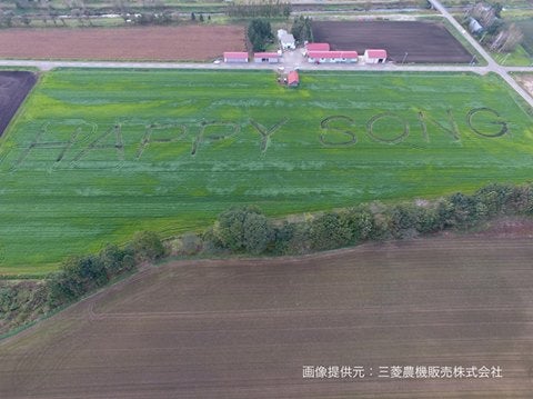 緑肥(肥料となる植物を栽培して鋤きこみます)畑の大きなキャンバスに、トラクターのGPSと自動操縦を駆使して、畑を耕しながら「HAPPY SONG」の大きな文字を書いて頂きました!