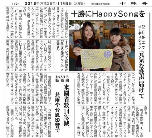 本日の十勝毎日新聞にオーディションの募集について記事が掲載されました(*´▽`*)