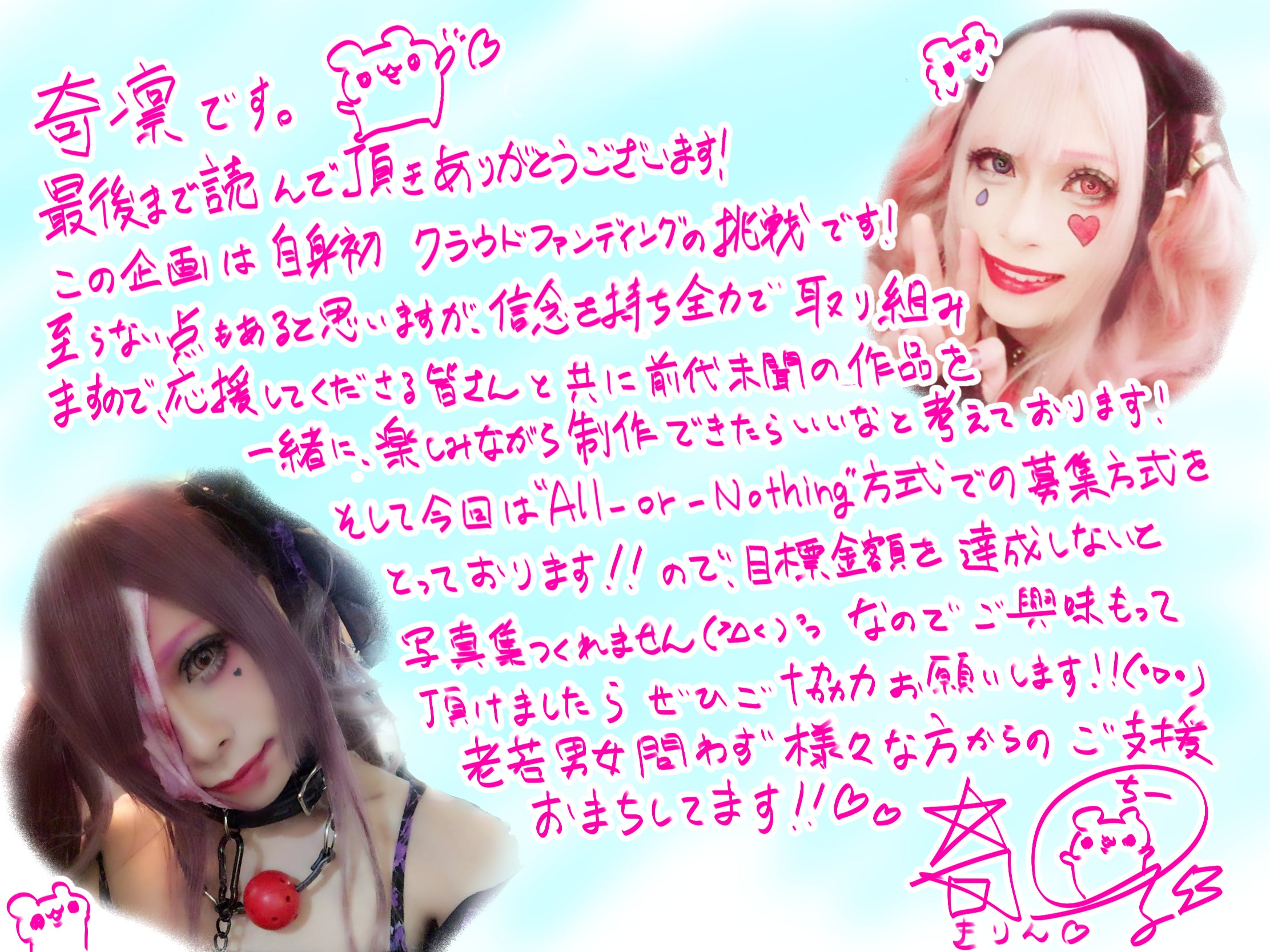 無事写真集が完成しましたらお楽しみ会を東京都と好評であれば名古屋市で入場無料で開催したいと予定しています。