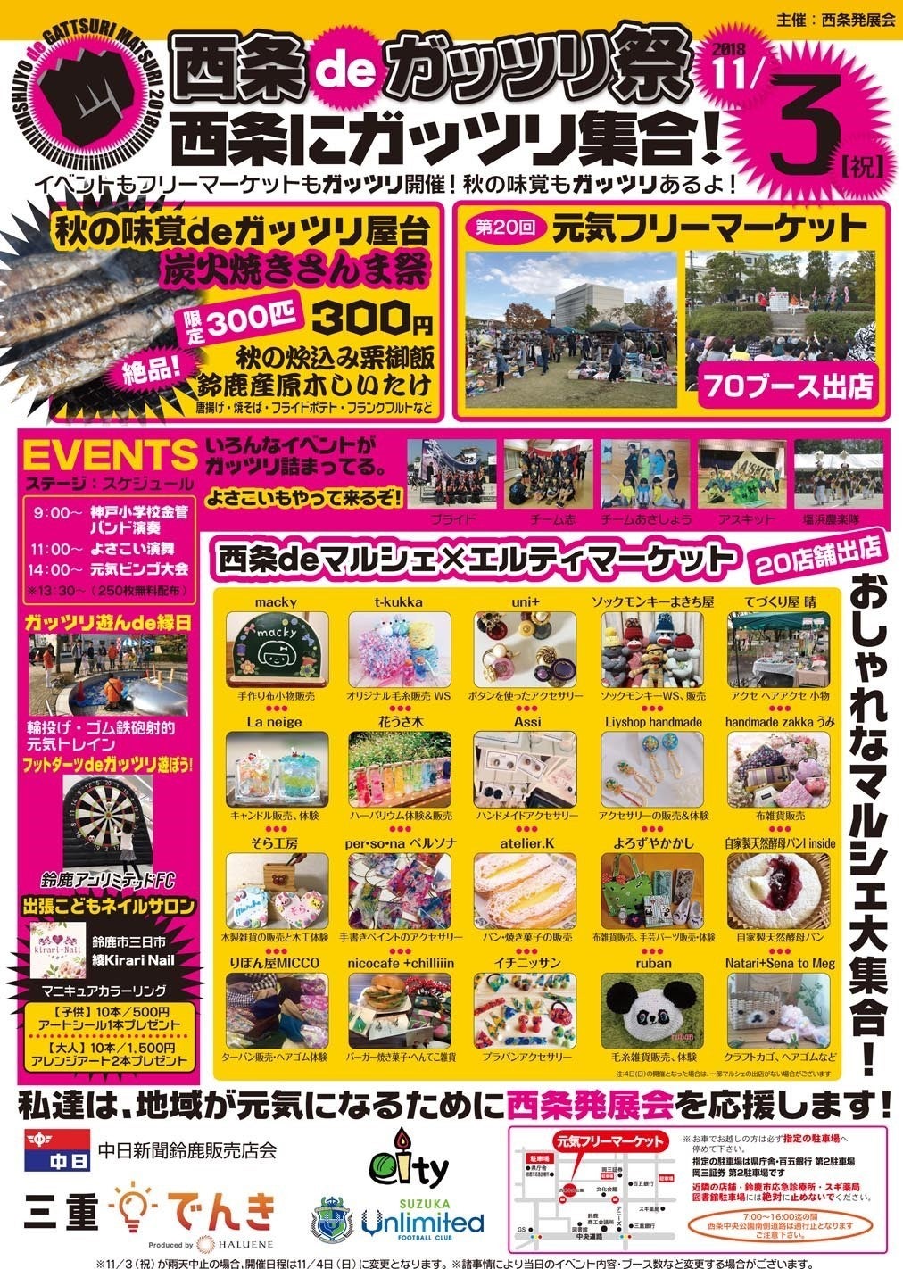 今までは元気フリーマーケット&元気ビンゴ大会として鈴鹿市西条発展会の皆様が企画していましたが、20回目の今年は規模を拡大して開催するものです。