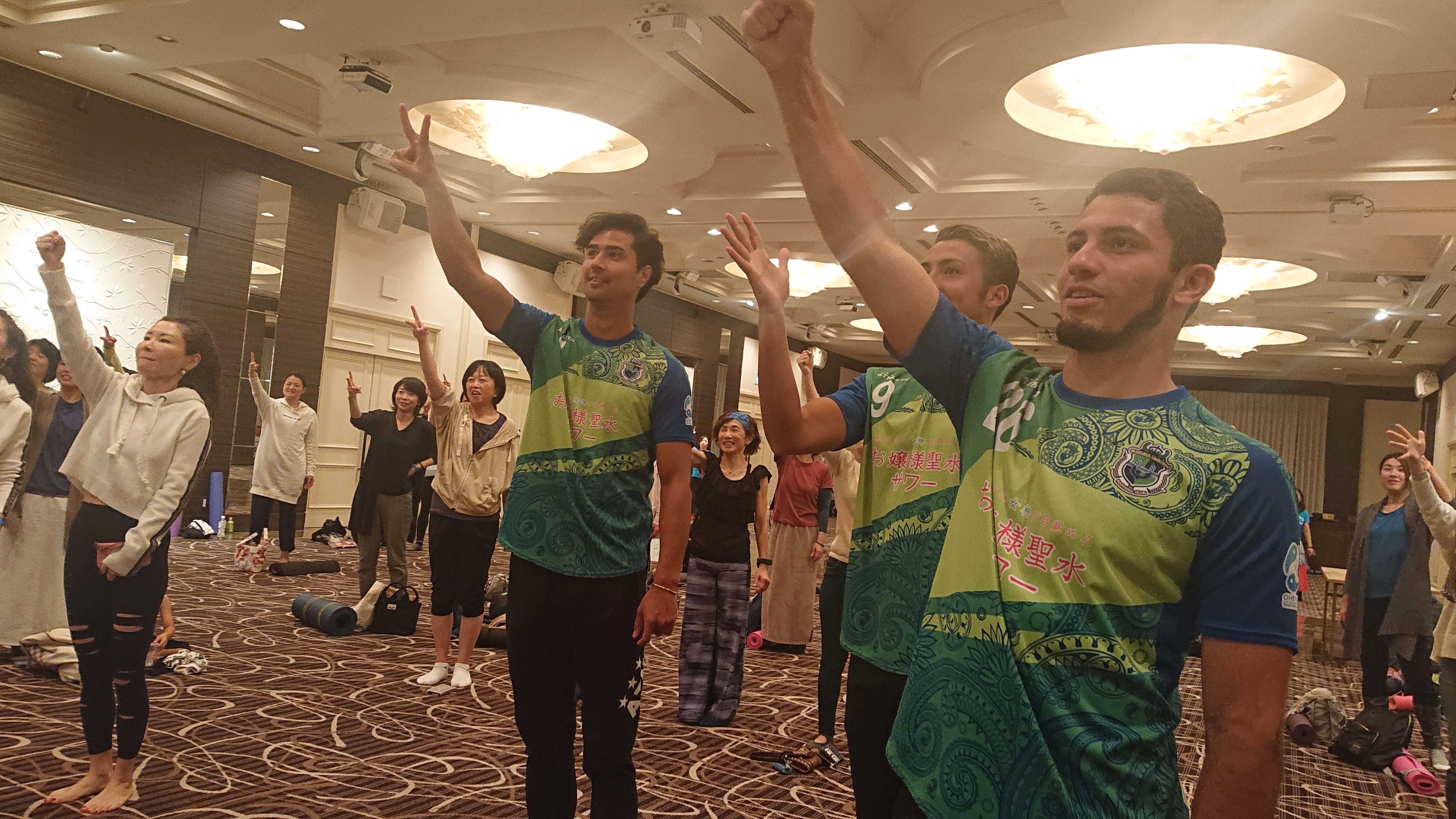 いつも鈴鹿アンリミテッドFCをご支援いただきまして誠にありがとうございます。11月3日(土)、四日市市にあるザ・グランドティアラ千寿にて行われました「Natural Return MIE vol.2」にエフライン・リンタロウ、藤沢ネット、フェレイラ・パブロ・ヤンの3選手がシークレットゲストとして出演させていただきました。「Natural Return MIE vol.2」は三重県最大級100名以上の方が参加されるヨガイベントで、スポンサードいただいているヨガスタジオMUKTA様が開催されていることもあり、お招きいただきました。3選手は今回のイベントの締めくくりとして行われた賞品抽選会に参加し、チームPRを行うとともにイベントを盛り上げさせていただきました。最初のじゃんけんは選手が行い、人数が絞れたところでインストラクターの先生に交代。藤沢選手は「パー出します」といいながら「グー」を出して会場から思わず「やられた~」と声が漏れるなど大変楽しく抽選会に参加させていただきました。最後は限定パーカーが賞品としてでてくると思わず3人も「参加したい!」と飛び入り参加。最後は参加者の方に交じって3選手とも楽しそうにじゃんけんをしていました。ヨガスタジオMUKTA様には今後もフットサルコートで選手も参加するヨガイベントを開催いただくなどコラボをしていく予定ですので、ぜひ皆様もご参加ください!