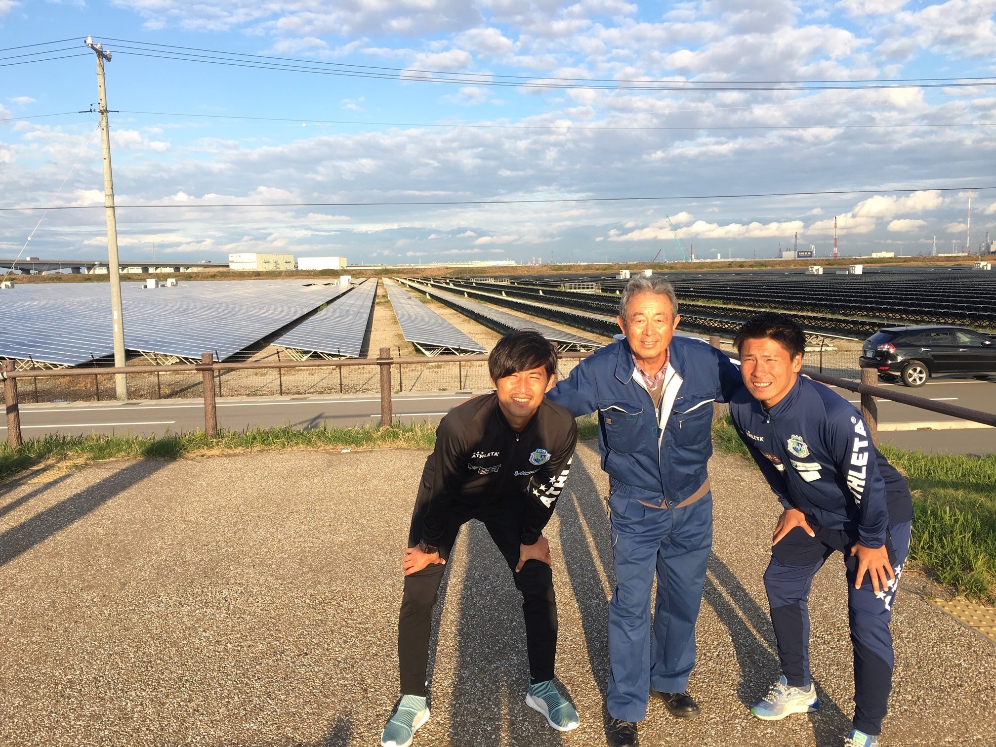 いつも鈴鹿アンリミテッドFCをご支援頂きまして誠にありがとうございます。11月6日(火)に鈴鹿アンリミテッドFCの野口遼太選手、高田浩幸コーチが、木曽岬メガソーラーの施設見学をさせて頂きましたので、お知らせいたします。当日は、木曽岬メガソーラー株式会社の岡本様に受入して頂きました。初めに、事務所にて木曽岬メガソーラーに関してのビデオ上映と岡本様よりご説明をいただきました。設置されている太陽光パネルの数は約20万枚で、全て直線に繋げると約320㎞になり、東京ー名古屋間の距離となるそうです!敷地面積は、約78ヘクタールで、ナゴヤドーム20個分の広さとなります。野口選手からは、「自然エネルギーの勉強になりました。遠征時に通る伊勢湾岸道の下にあるとは知りませんでした」との感想が出ました。次に、木曽川の干拓地にて綺麗にならぶ太陽光パネルを見学させて頂きました。この干拓地は、愛知県弥富町、三重県木曽岬町、桑名市にまたがる場所で、三重県、愛知県が推し進めるクリーン電力となっております。木曽岬メガソーラーの概要所在地:木曽岬町、桑名市、弥富市にまたがる木曽岬干拓地敷地面積:ナゴヤドーム約20個分パネル数:約20万パネル(全てをつなげると東京~名古屋間320㎞に相当)年間発電量:5,200万kWh/年(約14,500世帯の年間使用量に相当)2014年12月16日に商業運転開始、2034年12月15日まで発電事業を継続。施設見学の希望者はこちらから。木曽岬メガソーラー様、貴重な機会を頂きありがとうございました!
