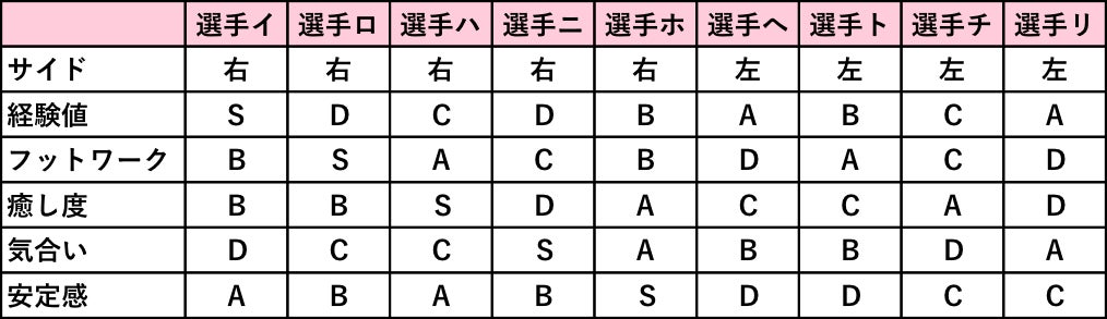 恥ずかしいので名前は伏せていますが、選手+スペシャルゲストの分析表をベースに、こんな選手と組みたい!と思う選手イ〜チのいずれかのリターンにお申込みください。