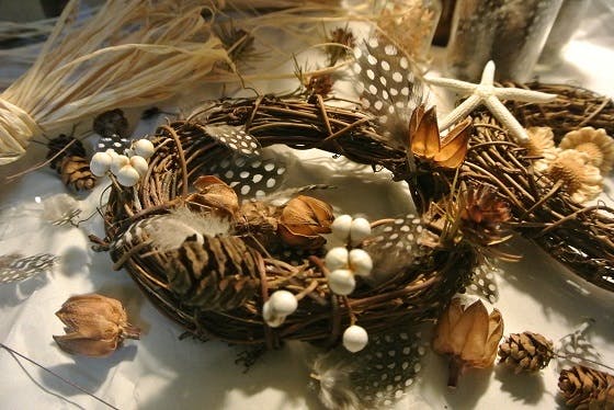 ドライフラワーと言っても、花だけではなく木の実や羽根、貝殻なんかも使って。
