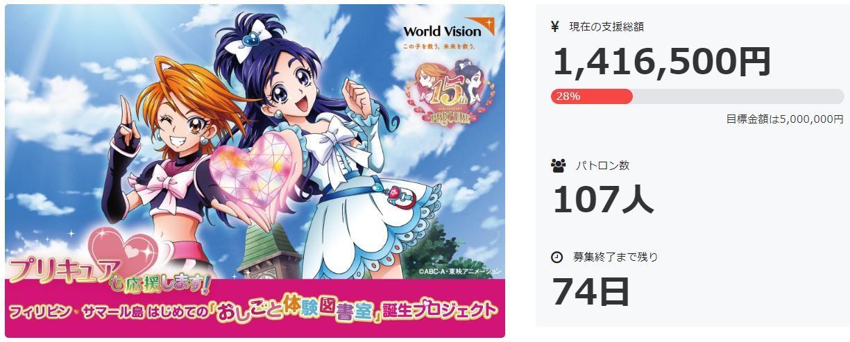 10月9日(火)に募集開始をさせていただき、もう少しで1ヵ月となります。 ワールド・ビジョン・ジャパンではフィリピン・サマール島の子どもたちに、なんとか図書室を届けたい一心でプロジェクトを開始いたしました。「プリキュア」の多大なご協力もいただいている今回のような取り組みは初めてです。 日頃よりワールド・ビジョン・ジャパンの活動をご理解と応援いただいている方、そしてプリキュアファンの方々に支えられ、目標金額の500万円の達成まで80%を突破し、残り約90万円となりました。 子どもたちを笑顔にする「素敵な、素敵な図書室」を誕生させたいと思っております。 図書室についても打ち合わせが進行しております。そちらについても今後、活動報告でお知らせをさせていただきます。 引き続き応援をよろしくお願い申し上げます。