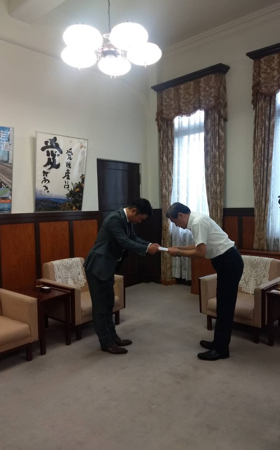 愛媛県 県庁本館3階 知事第2応接室にて、神野(こうの)副知事に被害にあわれた方への義援金の贈呈をいたしました。
