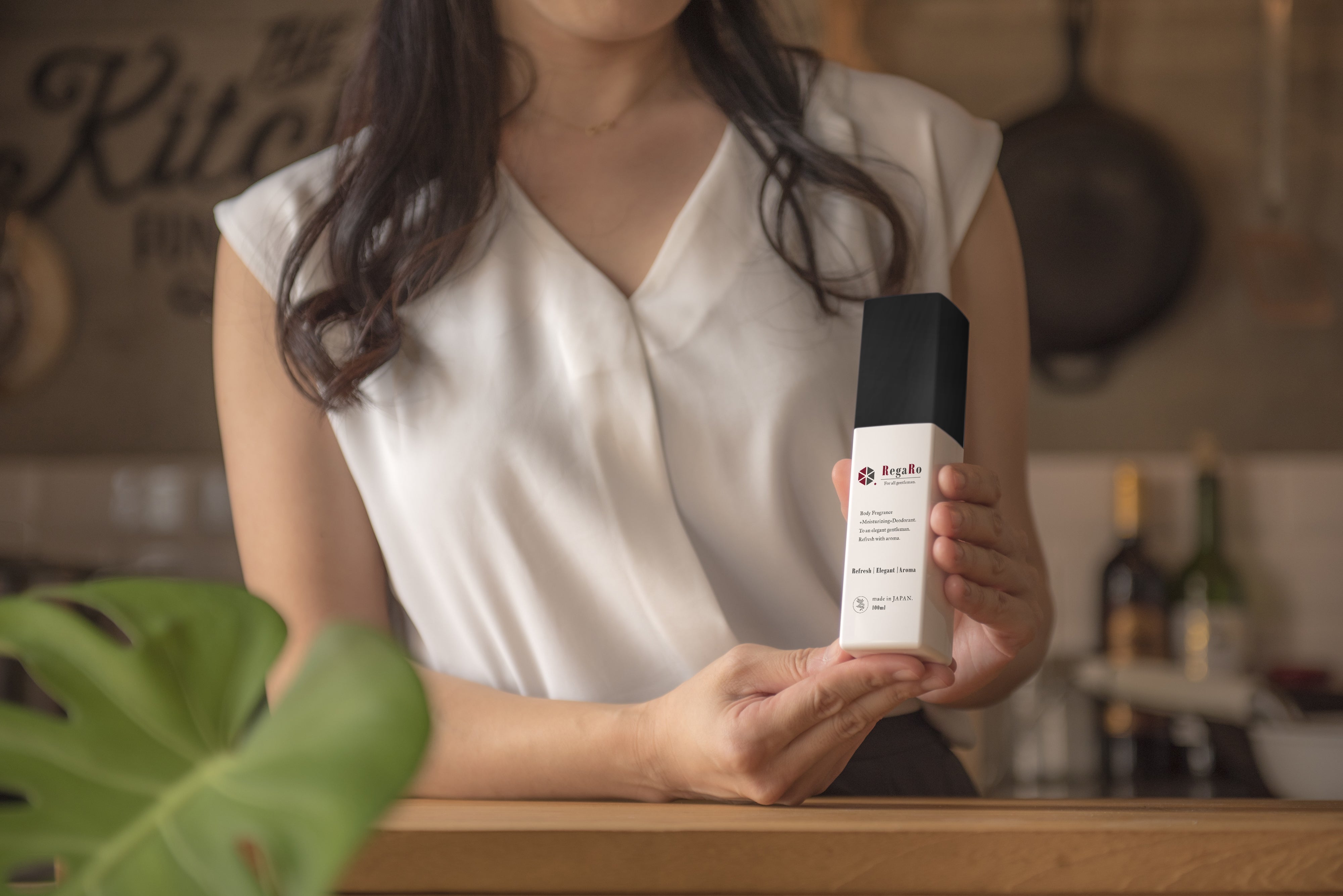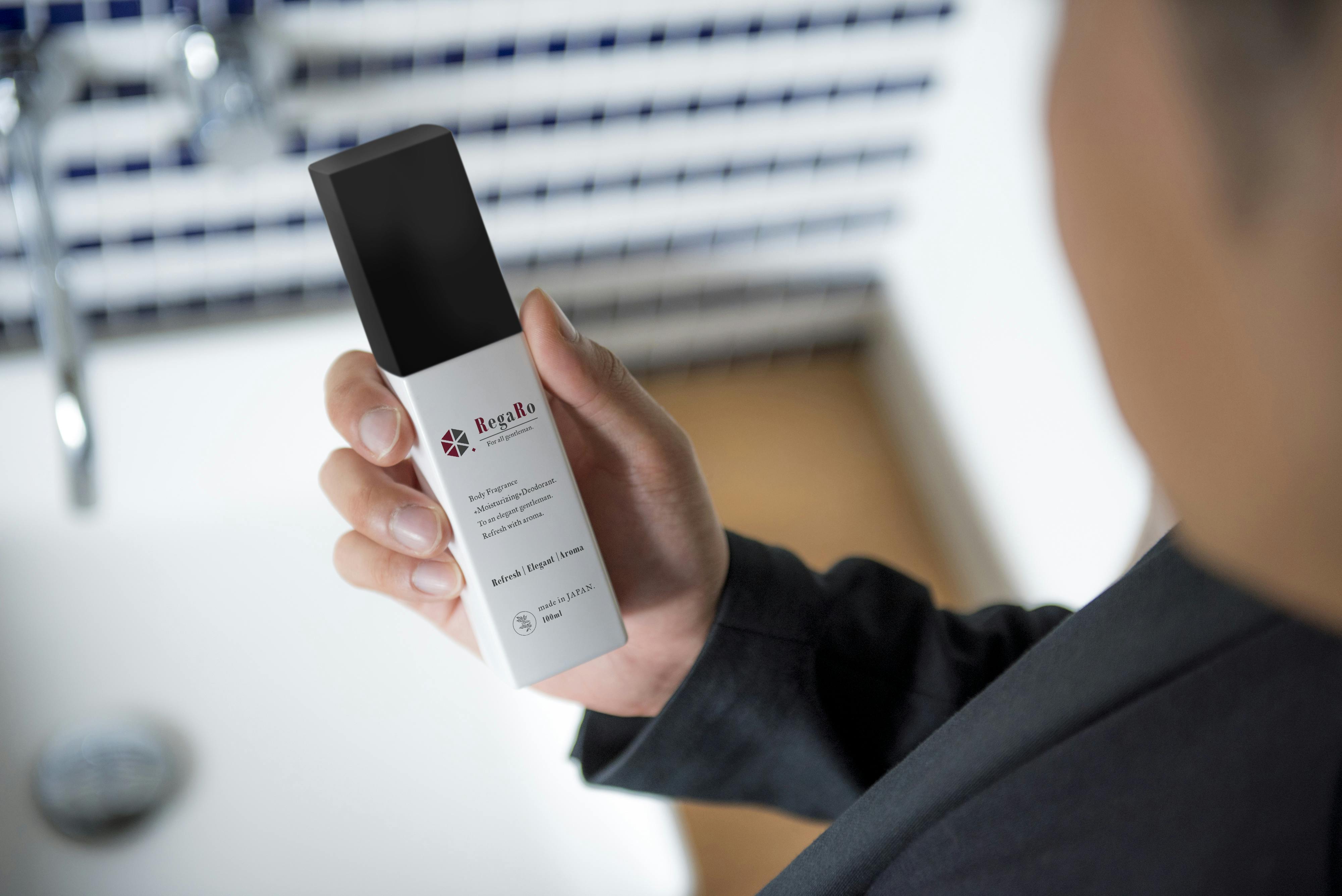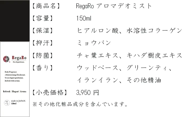 今回のRegaRoブランド商品の記念すべき第一弾は、ボディケアに着目したデオドラント商品のアロマデオミストです。「香水」、「保湿」、「デオドラント(汗抑、防菌、防臭)」の3つの機能が1つになったオールインワンボディーミストです。