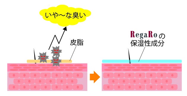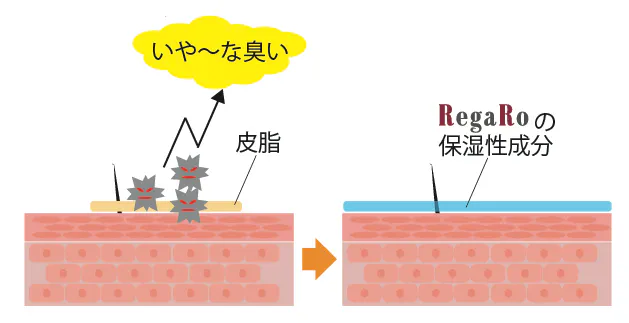 肌に存在している細菌が皮脂を分解する際に体臭独特のいや~な臭いを発生させます。RegaRoアロマデオミストでは肌に潤いを与えることで、嫌な臭いが発生する原因を弱めます。