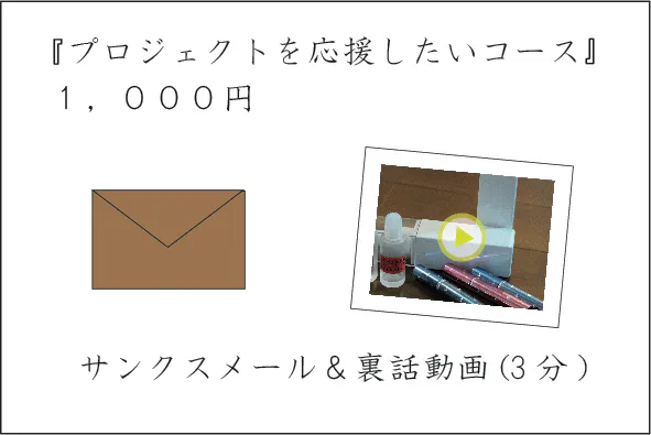本プロジェクトをただただ応援してくれる人のためにご用意いたしました。1,000円からご支援いただけます。リターンとしてサンクスメールと共に、開発途中のデザイン案や試作品、プロジェクトの裏話を動画でお届けします。