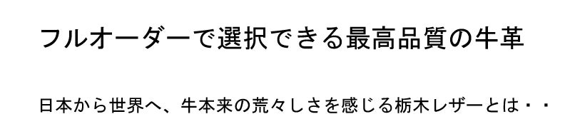 日本から世界へ発信、硬い牛革を様々なアパレル製品に活用できるように開発した栃木レザー。牛本来の皮膚に刻み込まれた荒々しさを感じられる味わい深さが魅力のフルベジタブルタンニンレザーです。