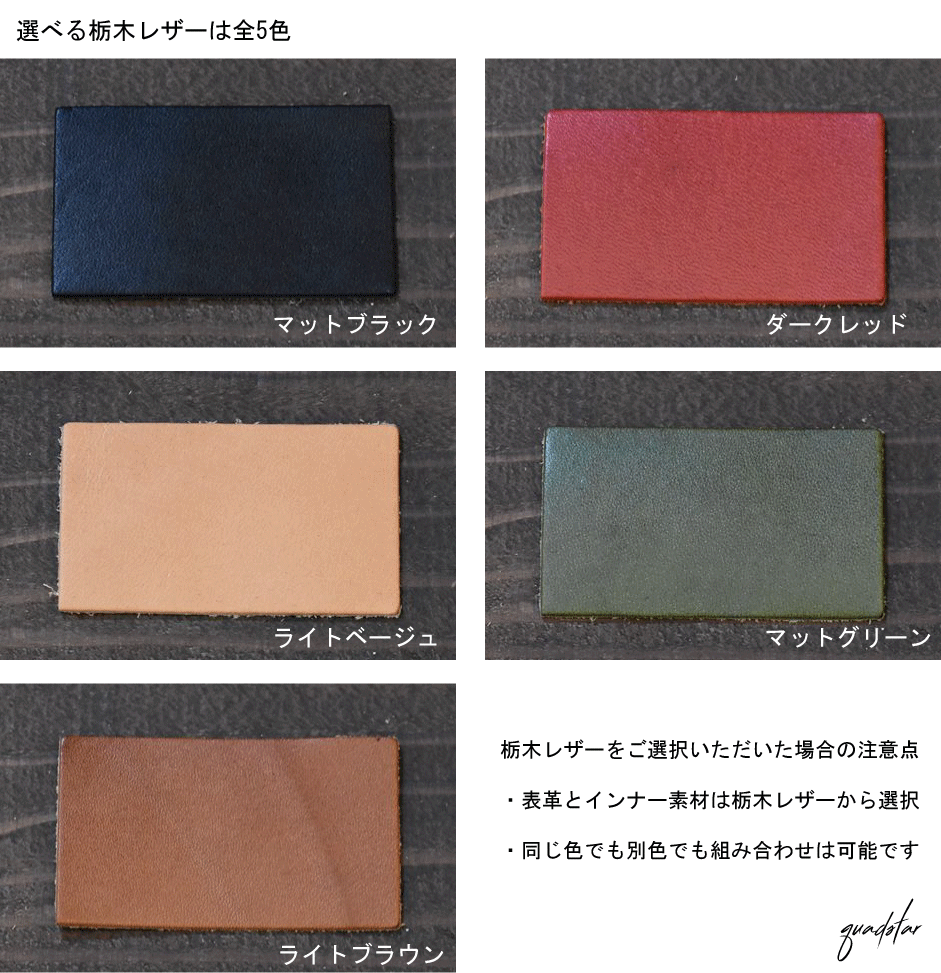 このプロジェクトではイタリアと日本を代表する"2種類計10色"の革素材を自由に組み合わせて、自分だけのプティ財布を製作して頂けます。クワッドスターが自信を持ってお勧めする革は、イタリア製 ワルピエ社"ブッテーロ"と日本製 "栃木レザー"です。