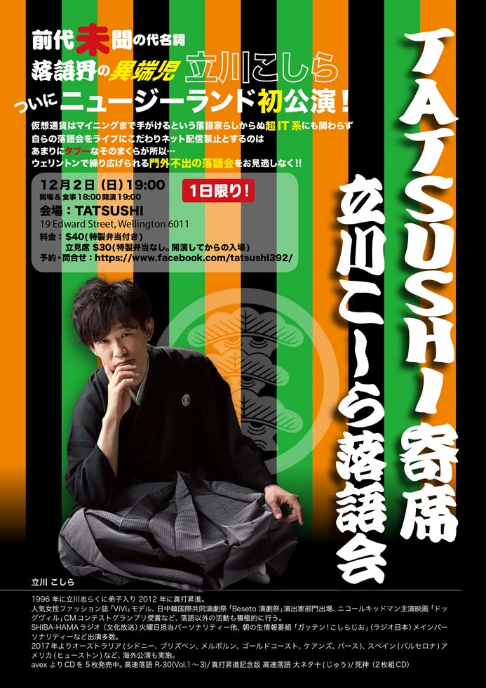 追加公演が決まりました! 2018年12月2日(日) TATSUSHI寄席 立川こしら独演会会場 TATSUSHI19 Edward Street, Wellington 6011開演 19:00(開場&食事18:00)料金 $40(特製弁当付き) 立見席$30(特製弁当なし。開演してからの入場)予・問 https://www.facebook.com/tatsushi392/
