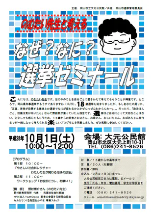 「のむたい先生と考える なぜ?なに?選挙ゼミナール」というタイトルで、我が街と政治を考える学習会を開催します。タイトルに「選挙」という文字がありますが、選挙に限らず、まちづくり全般のことを参加者と学べる講座になれば、と準備を進めています!