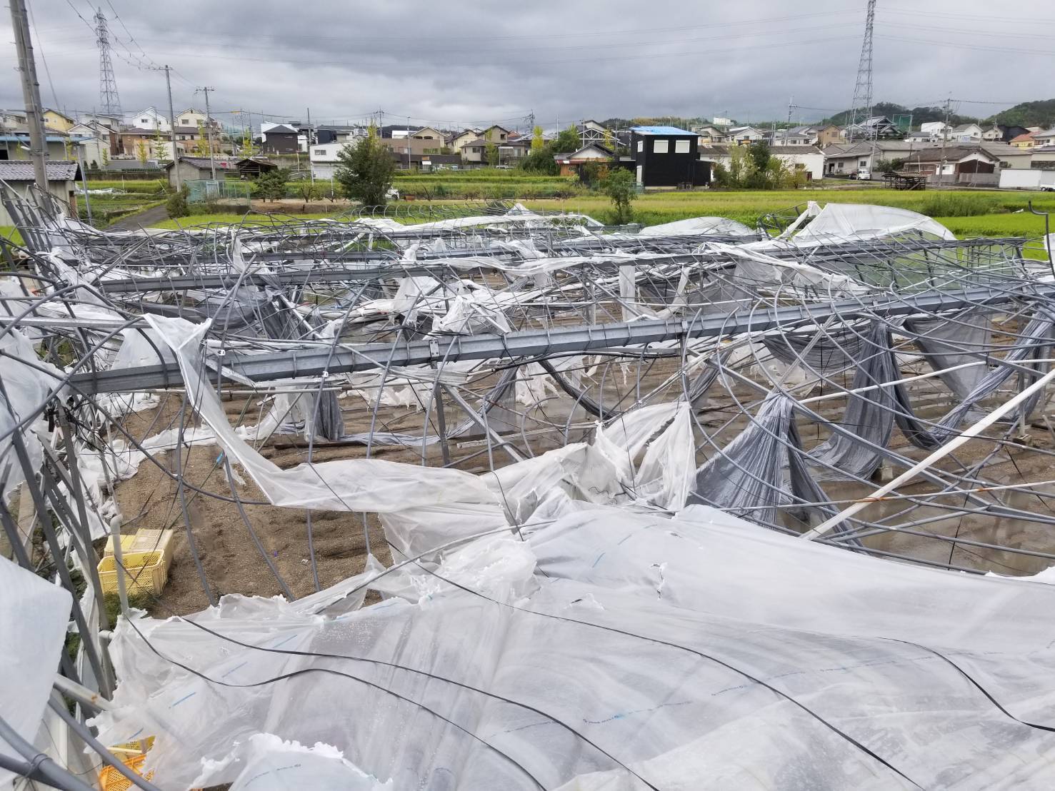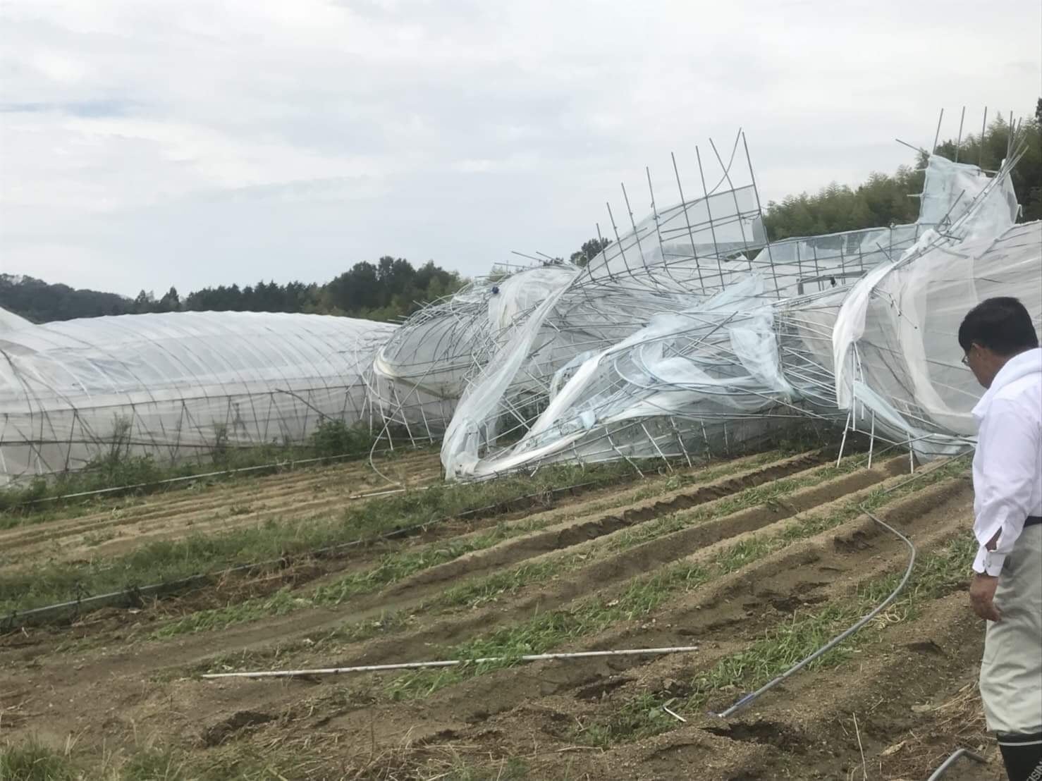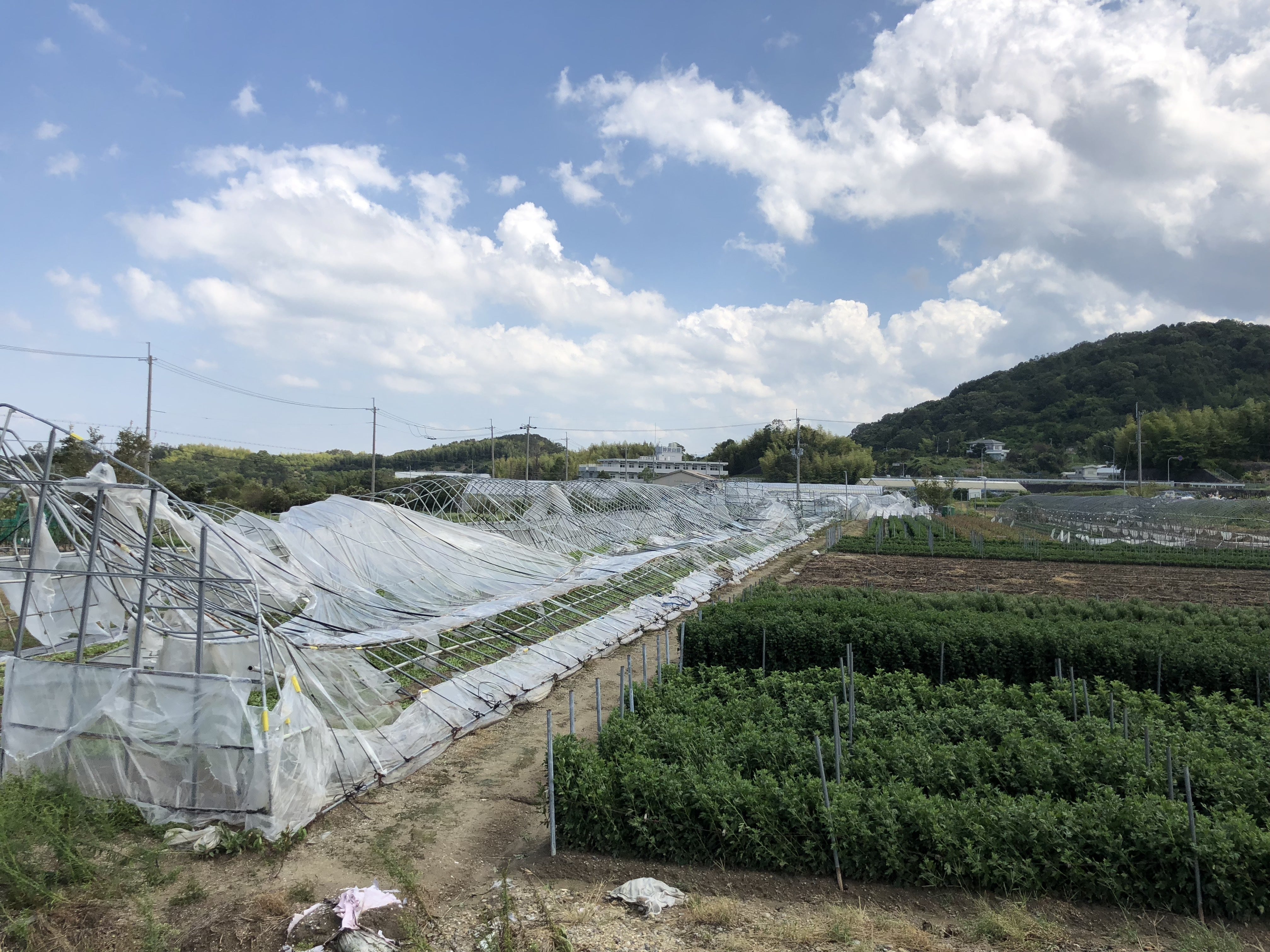 「長年水なすを作ってきた80代のじいちゃんが、そんな大したことにならへんっ!と言ってたんですが・・」と、潰れたハウスの前で途方にくれる水なす農家さん。