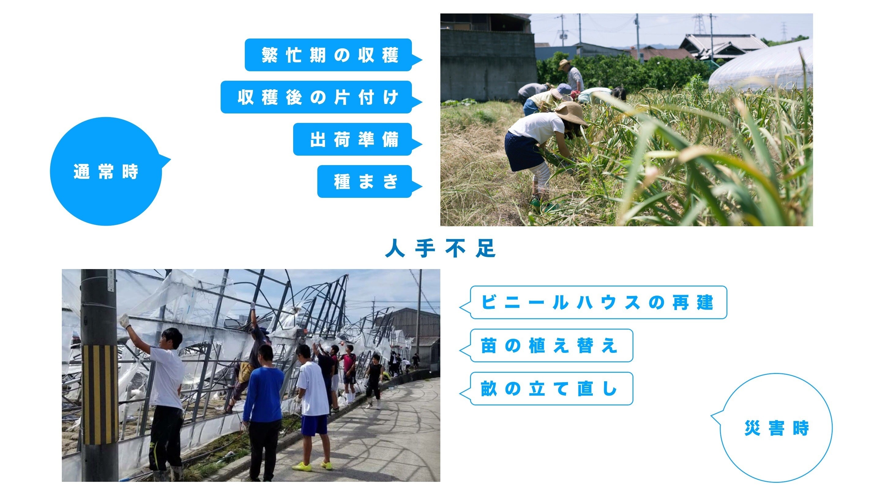 都市型農業と呼ばれる大阪の農業は、実は「慢性的な人手不足」という問題を抱えています。大規模な地方の産地のように、通年人を雇うほどの規模はなく、しかし繁忙期には人手が足りなく、家族や個人でなんとかまわしているというような状況です。