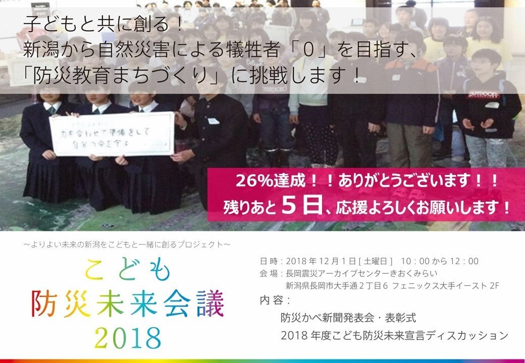 皆さま、おはようございます。いつもご覧いただき、ありがとうございます。クラウドファンディングの掲載期間も残りあと5日となりました。防災について学んだ子どもが学習成果を毎年発表し、交流する機会が新潟県内で続いていくことで、その学びは必ず子どもから家庭・地域に拡がります。過去の被災経験を活かして、子どもも大人も自然災害を自分事として考えられます。一人一人が安心・安全なよりよい未来を創る担い手になることで、「自然災害による犠牲者”0”の社会」を本気で目指します。その場を、皆さまから支えていただきながら継続していけることこそが、国民による、国民のためのまちづくりだと考えています。皆さま、どうか応援してください。よろしくお願いいたします!こども防災未来会議2018に応募していただいた防災かべ新聞の展示会スケジュールが確定しました。どの作品も一人一人の思い・願いが込められた素晴らしい作品です。お近くにお立ち寄りの際は、ぜひ足を運んでみてくださいね(*^_^*)【こども防災未来会議2018 防災かべ新聞コンクール展示会】①日時:平成 30 年 11月 26 日(月)午後から平成30年12月21日(金)午前中まで 会場:フェニックス大手イースト スクエア (〒940-0062 新潟県長岡市大手通2丁目6番地 フェニックス大手イースト) 展示作品:ご応募いただいた全62作品②日時:平成30年12月26日(水)から平成31年1月14日(月)まで 会場:かしわざき市民活動センターまちから (〒945-0066 新潟県柏崎市西本町三丁目2番8号) 展示作品:入賞作品及び上越エリア校の作品(予定)③日時:平成 31 年 1月 25日(金)から平成30年2月13日(水)午前中まで 会場:新潟県庁2階西回廊ギャラリー(〒950-8570 新潟県新潟市中央区新光町4番地1) 展示作品:入賞作品(予定)楽しみにしていてくださいね。よろしくお願いします!(^^)!最後までお読みいただき、ありがとうございました。 NPO法人ふるさと未来創造堂 中野 雅嗣