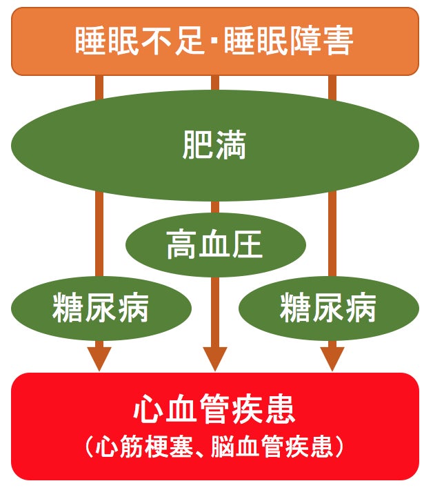 睡眠不足が続くと、睡眠中に分泌される成長ホルモンの絶対量が少なくなるため、体の細胞を修復したり新陳代謝を促したりすることが出来にくくなります。つまりホルモンバランスの影響で、心血管疾患、糖尿病、高血圧、脂質異常症など病気にかかり易い身体をつくってしまうと言われています。
