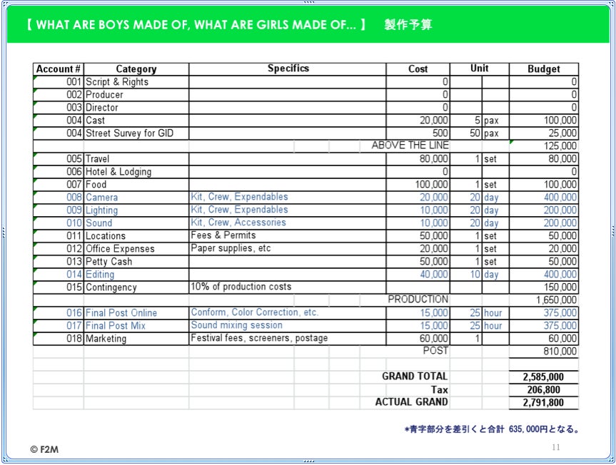 ドキュメンタリー「Gender X」のトータル制作費は約280万円を予定しています。このうち、現時点で40万円は集まりました。また私費100万円を投入しています。今回のクラウドファンディングでは、編集に関わる費用、学校など教育施設での上映費用の一部60万円を募りたいと思います。いま集まっている40万円と、この60万円を合わせた100万円があれば、2018年11月に予定している編集費用がまかなえる予定です。具体的には、編集スタジオのレンタル代、エディターの人件費、音楽収録代、資料映像購入費、アニメーション制作費などが含まれています。