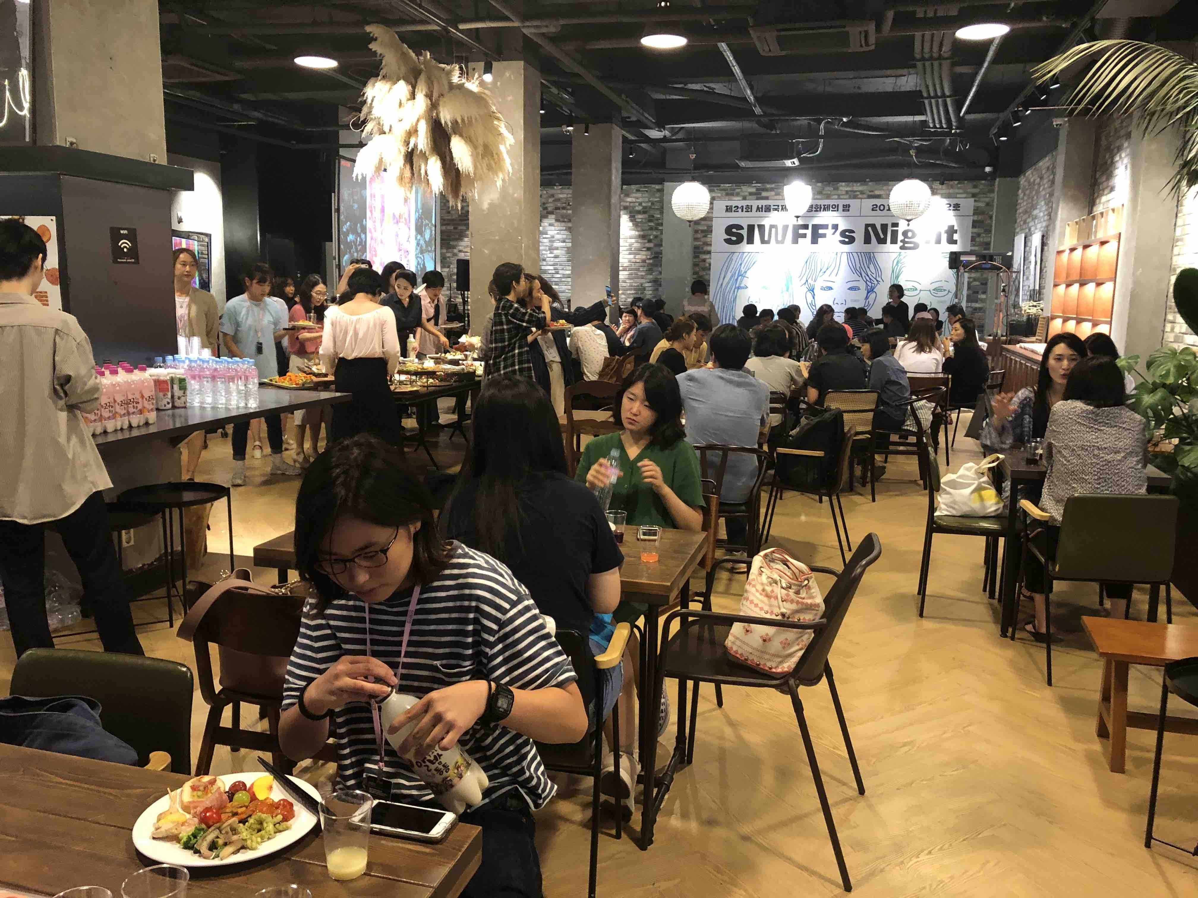 2日の夜は、みなさまと一緒に交流会が開かれました。ゲストのみなさま(監督や俳優さんなど)、映画関係者のみなさま、スタッフのみなさま総勢100名くらいでしょうか。素敵なパーティーフードと音楽付きでした。