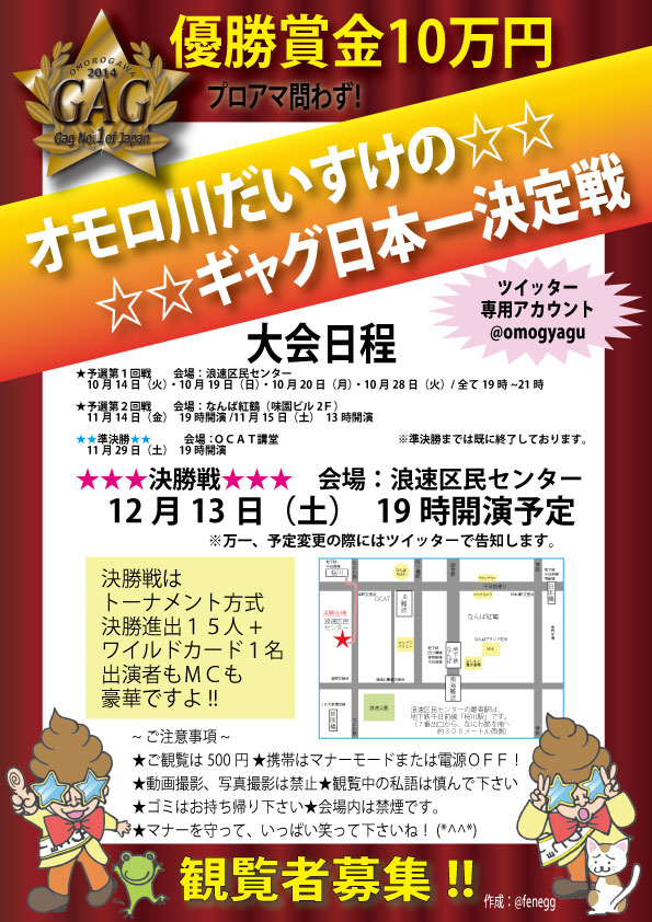 この大会も今年で3回め。今年は名実ともに「ギャグ日本一決定戦」に相応しい大会にすべく、東京と大阪の2ヶ所で予選を行い、優勝賞金も10万円から30万円にアップします。