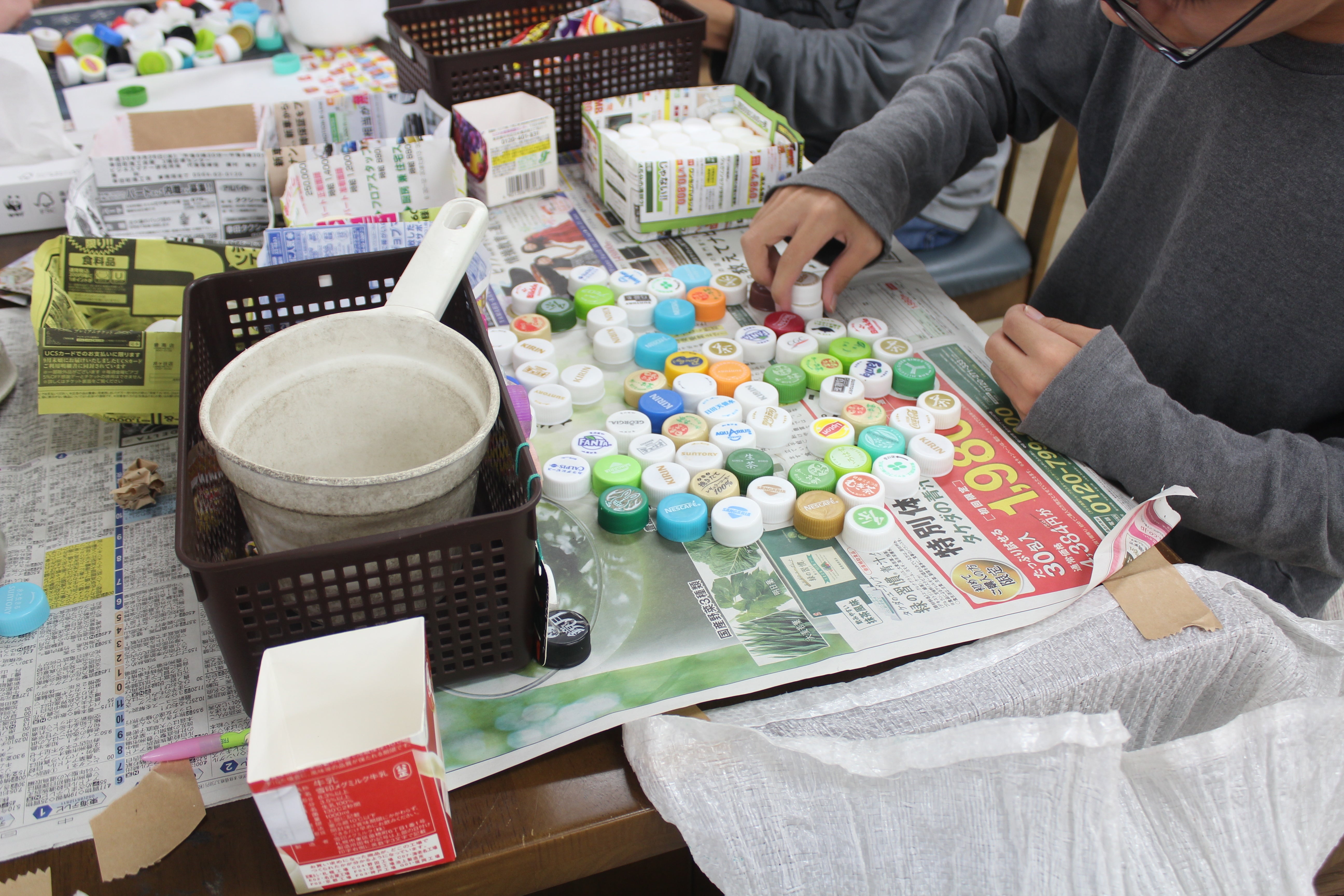 ③地元企業から頂いている内職作業では、ペットボトルキャップの選別やガチャガチャの検品・梱包作業をしています。