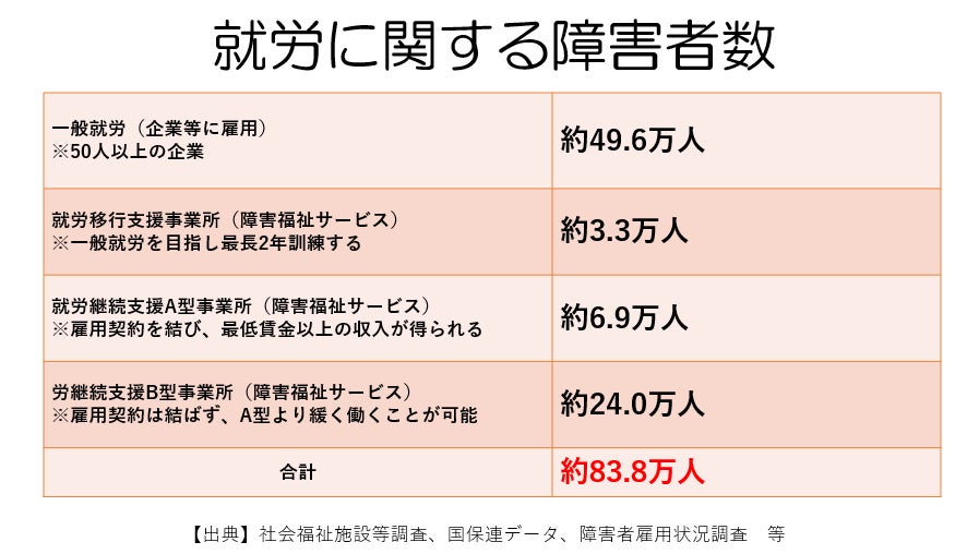 これを踏まえると、約362万人が就労の対象になるにも関わらず、約84万人しか実際に就職したり、就職に向けて訓練したり、就職は難しいけれども自分のできることで働く現場に携わっていない現状があります。