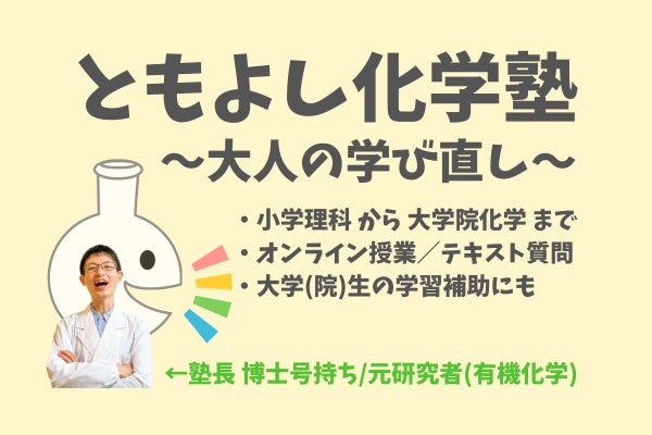 有機化学の研究をしていた「ともよし」(博士号持ち)と化学を学びましょう(大人の学び直しに最適です)。小学理科から大学院化学まで、楽しくやさしく授業します。オンライングループ授業(質問可)、授業録画視聴、テキストチャット(Slack)での質問もできます。オプションでZoom個別質問対応・個別授業も。