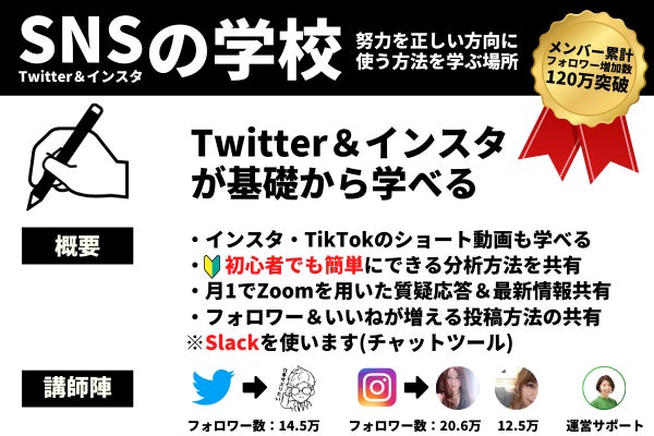 SNSのビジネス活用や副業の仕方、フォロワー&いいねを増加させる投稿の仕方、簡単にできる分析法など共有します。再現性を重要視してデータを元に学べます。SNSが浸透し個人ブランディング、発信力の強化が重要と言われるようになってきました。発信力を持つことで仕事や人生にそれを活かすことができます。