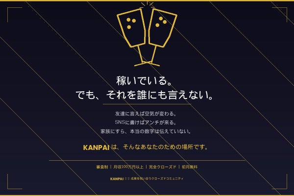 KANPAIは、月収100万円以上の人だけが集まる、 成果を堂々と共有できる完全クローズドコミュニティです。