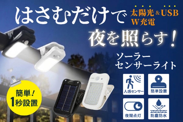 工事不要でどこでも設置。ソーラー充電で自動点灯するクリップ型センサーライト
