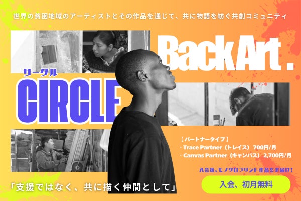 BackArt. Circle は、世界の貧困地域で生きるアーティストと、その作品を通じて共に物語を紡ぐ共創コミュニティです。あなたの参加が、遠い国のアトリエを灯し、新たな色と希望を生み出します。一緒にBackArt. を創り上げてくれる仲間を募集しています。