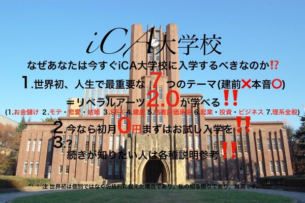 なぜあなたは今すぐiCA大学校に入学するべきか?1.世界初、人生で最重要な7つのテーマ(建前×本音○)=リベラルアーツ2.0(1,お金儲け 2,モテ・恋愛・結婚 3,SEX 4,健康 5,他者評価承認 6,起業・投資・ビジネス 7,理系全般)が学べる!2.今なら初月0円!3.?続きは↓もっと見るを!