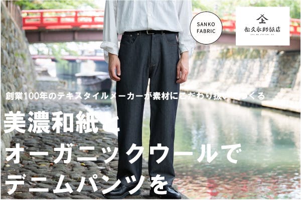 テキスタイルメーカーがこだわり抜いた美濃和紙とオーガニックウールのデニムパンツ