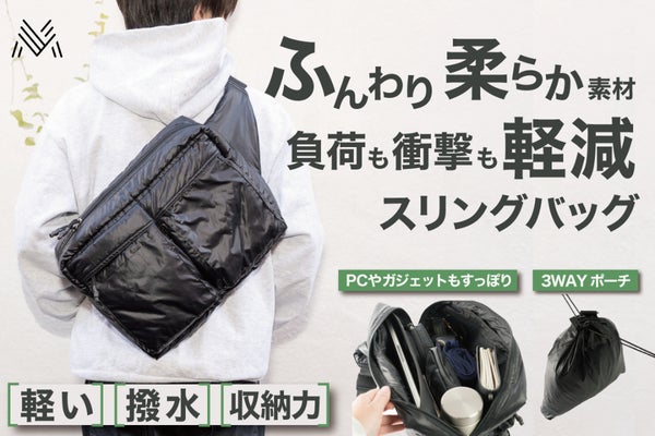 中綿素材の軽量スリングバッグ!PCもすっぽり12個のポケット、水にも汚れにも強い