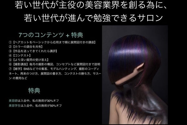 若い世代が主役の美容業界を作るために、進んで勉強できるサロン。私はロンドンのSASSOON ACADEMYで成績1位で卒業しました。オンラインサロンではカットの理論やベーシック、カラーの調合、などをメインで共有毎月コンテストを行い、一位には商品があり、勉強する方は損しません。