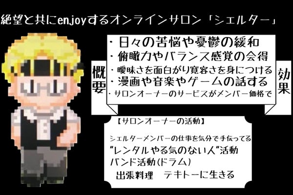 文字通りオンラインシェルター的役割を果たすサロンです。何かを皆で成し遂げる!でもなければ、コミュニティワークを強要したりもしません。ただただ人生を生きやすくする、生きやすくなる方法を考え発信してる場所です。毎日、様々な時事ネタ具体的な事例から少しでも誰かが生きやすくなる投稿を心がけています。