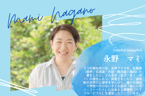 一般社団法人ColorFul-HappyFull代表理事:永野マミです。様々な理由で学校へ行けない子ども達が「楽しいモノ・コト・ヒト」に出会える居場所フリースクール【カラフルハピフル】を運営をしています。他にはない様々なカリキュラムに加え、心理学、SST、お金の勉強(経営)の場を展開しています。