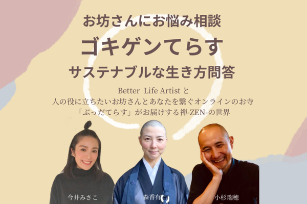 お坊さんとあなたを繋ぐオンラインのお寺「ぶっだてらす」の森香有、小杉瑞穂と、あなたのゴキゲンが世界をサステナブルにするをテーマにBetter Life Artistを運営している今井みさこによる、Club Houseでのお悩み相談ルーム、「ゴキゲンてらす」のコミュニティです。