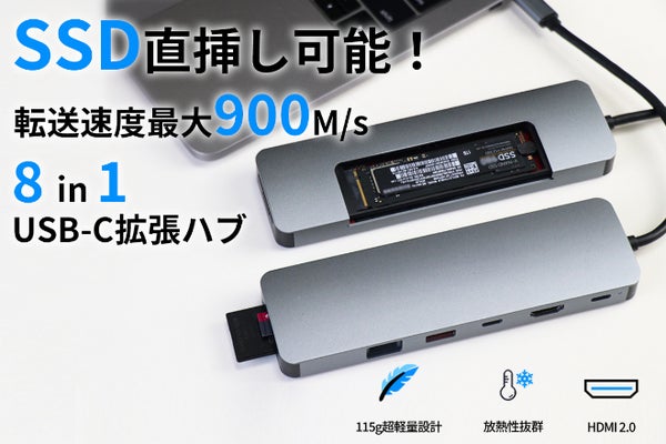 SSDドライブ機能搭載、8in1多機能拡張ハブ【速度最大約900M/s】