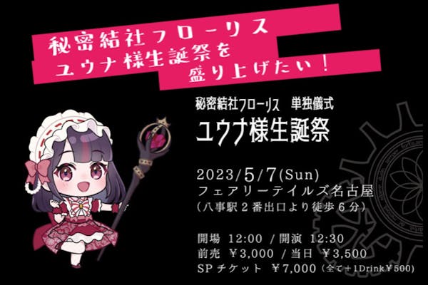 募集終了SUCCESS募集終了5/7 ユウナ様(秘密結社フローリス)生誕祭応援プロジェクト