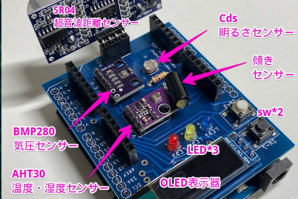 Arduino用 センサー基板 温湿度,気圧,距離,OLED表示,LED他
