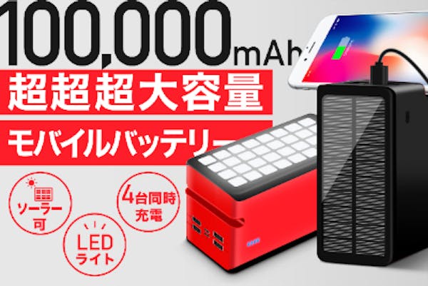 コンパクトで10万mAhモンスター級大容量!ソーラー充電付きモバイルバッテリー